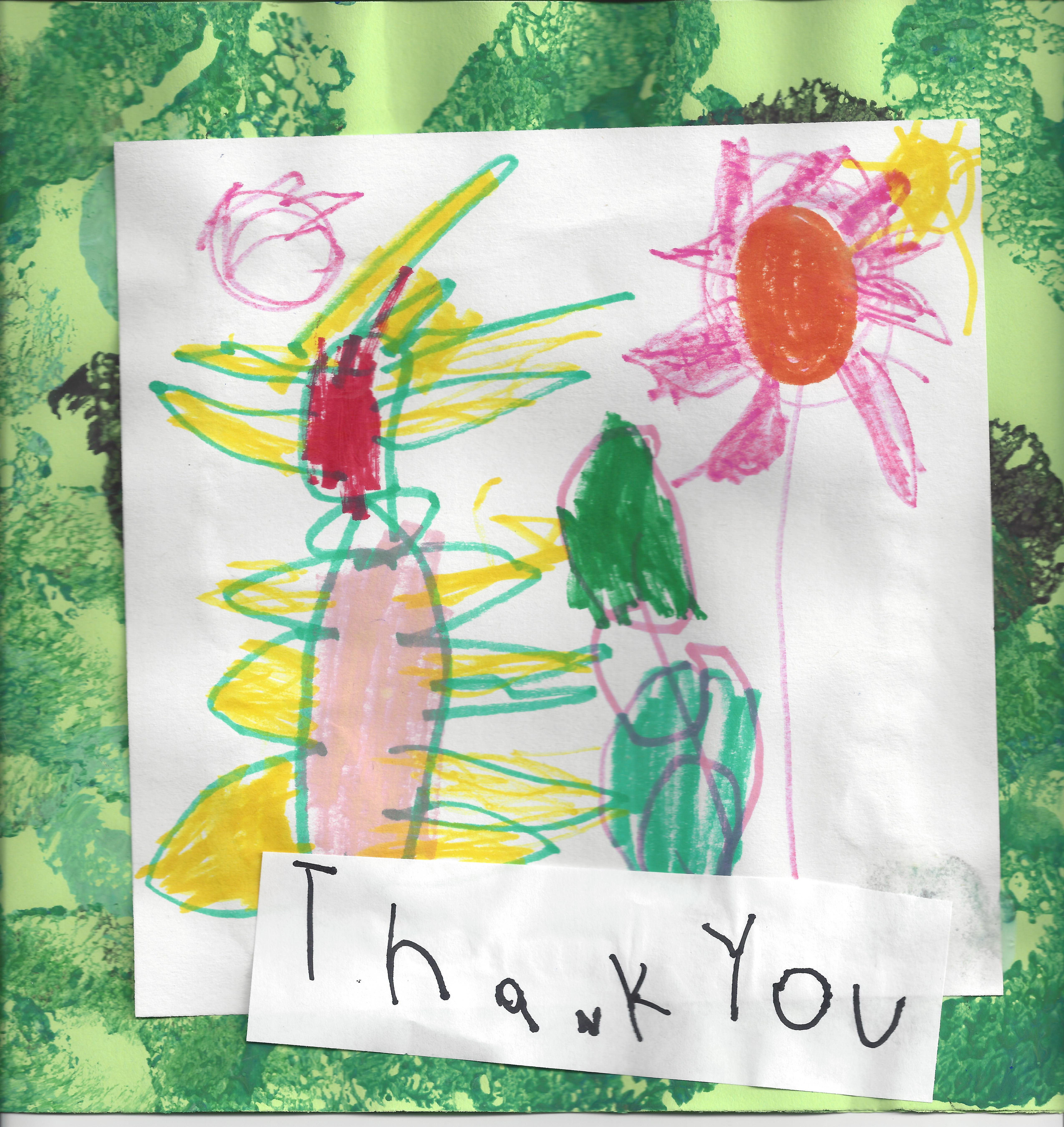 We were given a nice certificate of appreciation from the school and charming hand made card by the Pre-Kindergarten art class. Inside the card was a quote from Robert Louis